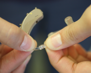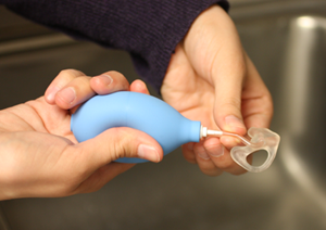 | Check tubing for moisture blockageIf changing the battery doesn’t restore hearing aid performance, check the earmold tubing for blockage. If there is moisture in the tubing, then sound cannot leave the sound opening of the earmold. If you see moisture in the tubing, gently flick the earmolds to force the moisture out of the tubing. |