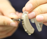 | REPLACING WAX GUARDSYour hearing aids are equipped with wax guards that will protect the receivers from wax. The wax guards should be replaced every two to four weeks, depending on how much wax your ears produce. Your audiologist will provide you with additional wax guards. To change the wax guards, insert the empty end of the tool straight into the wax guard on the hearing aid. Twist and pull out the black tool. The wax guard should come out with the tool. Next, insert the end of the tool with the new wax guard attached to it straight into the opening of the receiver. Apply pressure, twist, and pull the black tool out. The wax guard should remain in the receiver. To ensure the wax guard is securely in the receiver, press down on it with your finger. |
