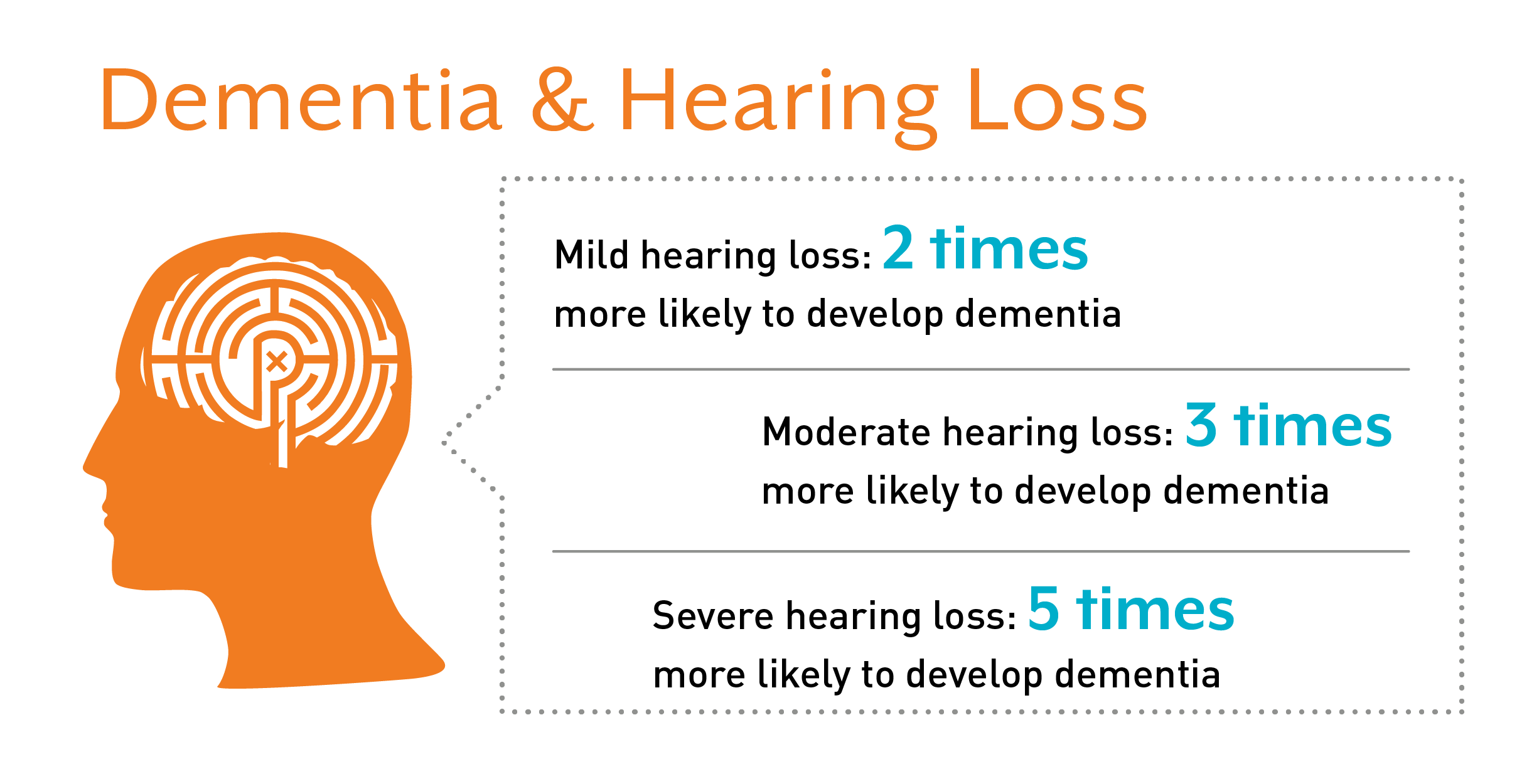 | Dementia and hearing lossHearing loss and dementia are more common as you get older. The latest research shows that’s no coincidence. Scientists are finding more and more evidence that trouble with hearing makes you more likely to go on to have dementia, a condition marked by memory loss and trouble with thinking, problem-solving, and other mental tasks. Scientific studies have shown that the use of hearing aids reduce the risk of cognitive decline and of developing dementia. Adults with hearing loss are significantly more likely than adults with normal hearing to develop dementia |